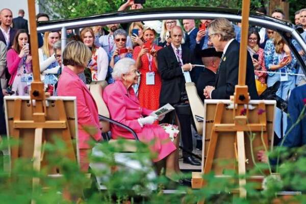 2022年5月23日,英国伦敦,英国女王伊丽莎白二世参观切尔西花展。切尔西花展由英国皇家园艺学会主办,是英国最盛大也是全球最著名的园艺博览会之一。本届花展为了纪念英国女王伊丽莎白二世登基70周年,特推出一种名为“伊丽莎白”的新品种玫瑰。图/视觉中国