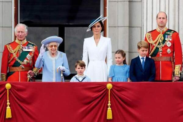 2022年6月2日,英国女王伊丽莎白二世在白金汉宫的阳台上观看女王生日游行。左起:英国查尔斯王子,女王伊丽莎白二世,英国剑桥王子路易斯,英国剑桥公爵夫人凯瑟琳,英国剑桥公主夏洛特,英国剑桥王子乔治,英国威廉王子。图/视觉中国